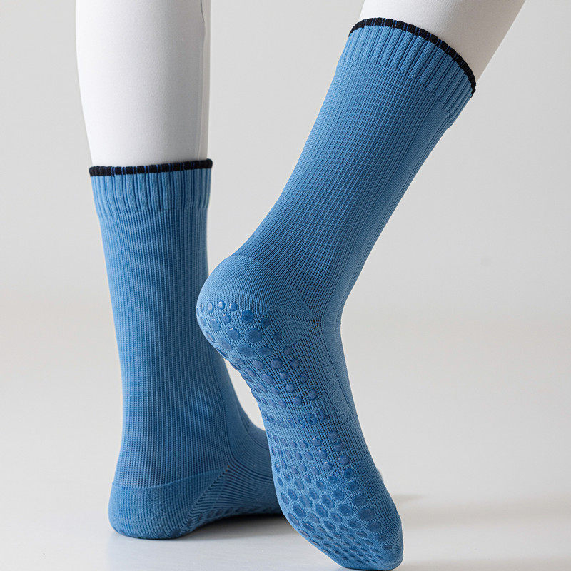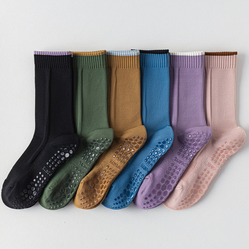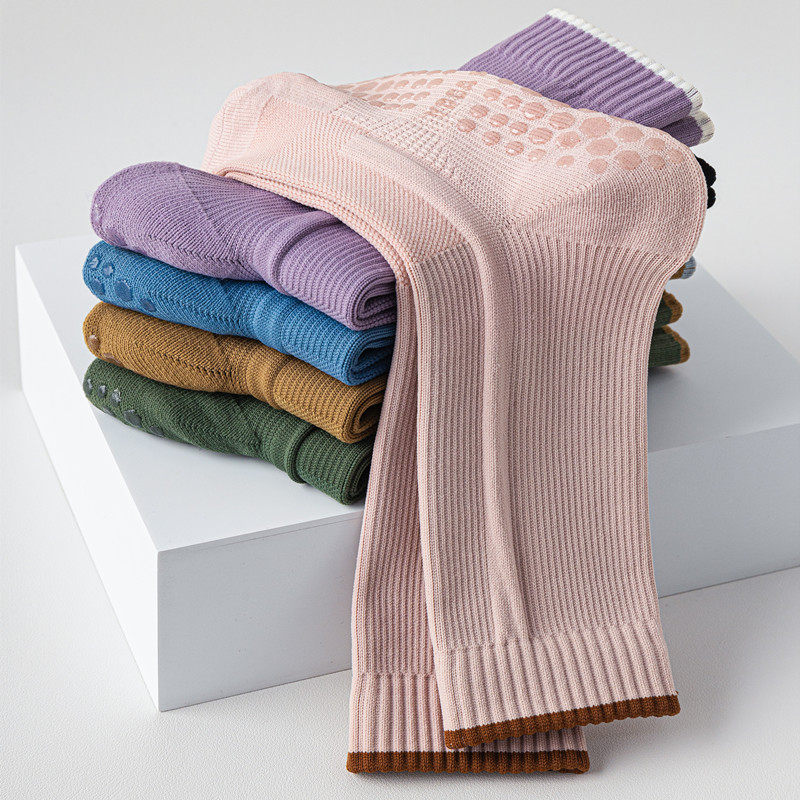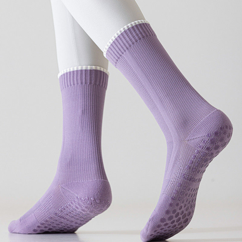 Indoor socks featuring split toes for better balance and toe mobility. Non-slip grip provides security on smooth floors during yoga, pilates, and barre workouts. Mid-calf height ensures coverage while maintaining flexibility.